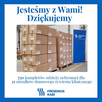 Firma Fresenius Kabi pomaga w walce z pandemią i przekazuje ponad 750 kompletów odzieży ochronnej lekarzom, pielęgniarkom i personelowi z poradni domowego leczenia żywieniowego w całej Polsce. Wartość przekazywanego sprzętu to kwota ponad 100 tysięcy złotych. Inicjatywa została zrealizowana w odpowiedzi na apel największych polskich towarzystw naukowych zajmujących się żywieniem klinicznym.